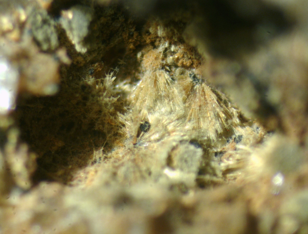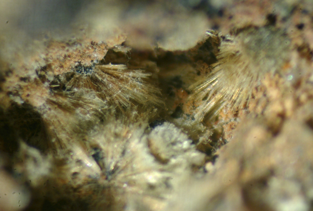 Szalmasárga strunzit tűk halmaza, sárgásbarna keckit kristályok, vörösesbarna beraunit kéve. Strunzit, keckit a típuslelőhelyről.